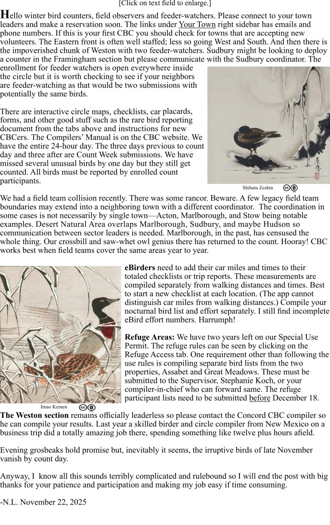 NOTE: Feeder count could be diminished in many communities due to the STRONG recommendation by MA Div of Fish. and Wildlife that bird feeding be stopped in communities with black bears (Boxborough is one of them). – Rita Grossman Boxborough